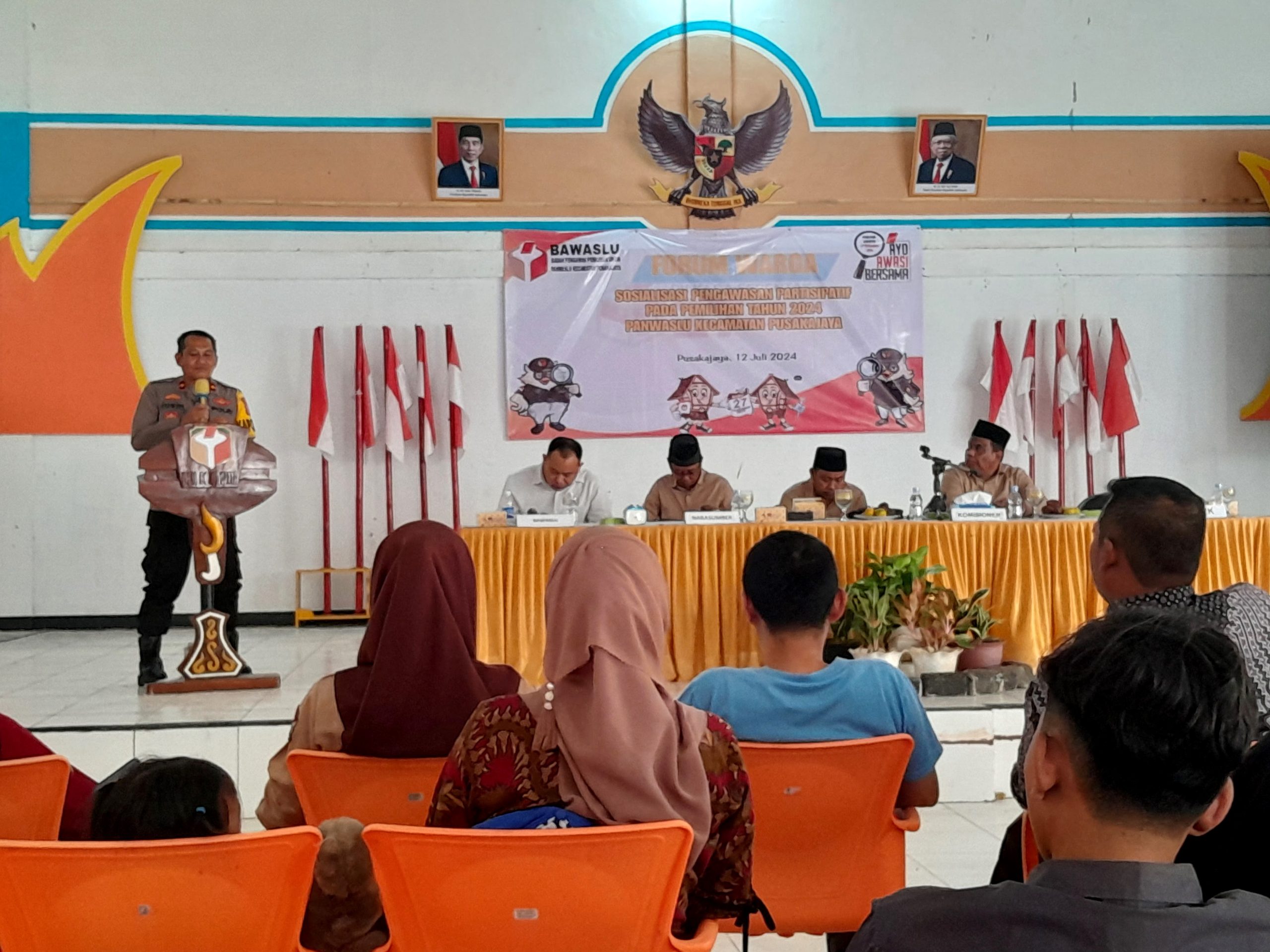 SUBANG,Givalnews – Kapolsek Pusakanagara, Polres Subang Kompol Dr. R.Jusdijachlan, S.H, M.M, CHRA menghadiri kegiatan Forum Warga dalam rangka sosialisasi pengawasan partisipatif pada Pilkada Tahun 2024, yang dilaksanakan oleh Panwascam Pusakajaya bertempat di aula Kantor Desa Bojong Jaya Kecamatan Pusakajaya, Jumat (12/07/2024).