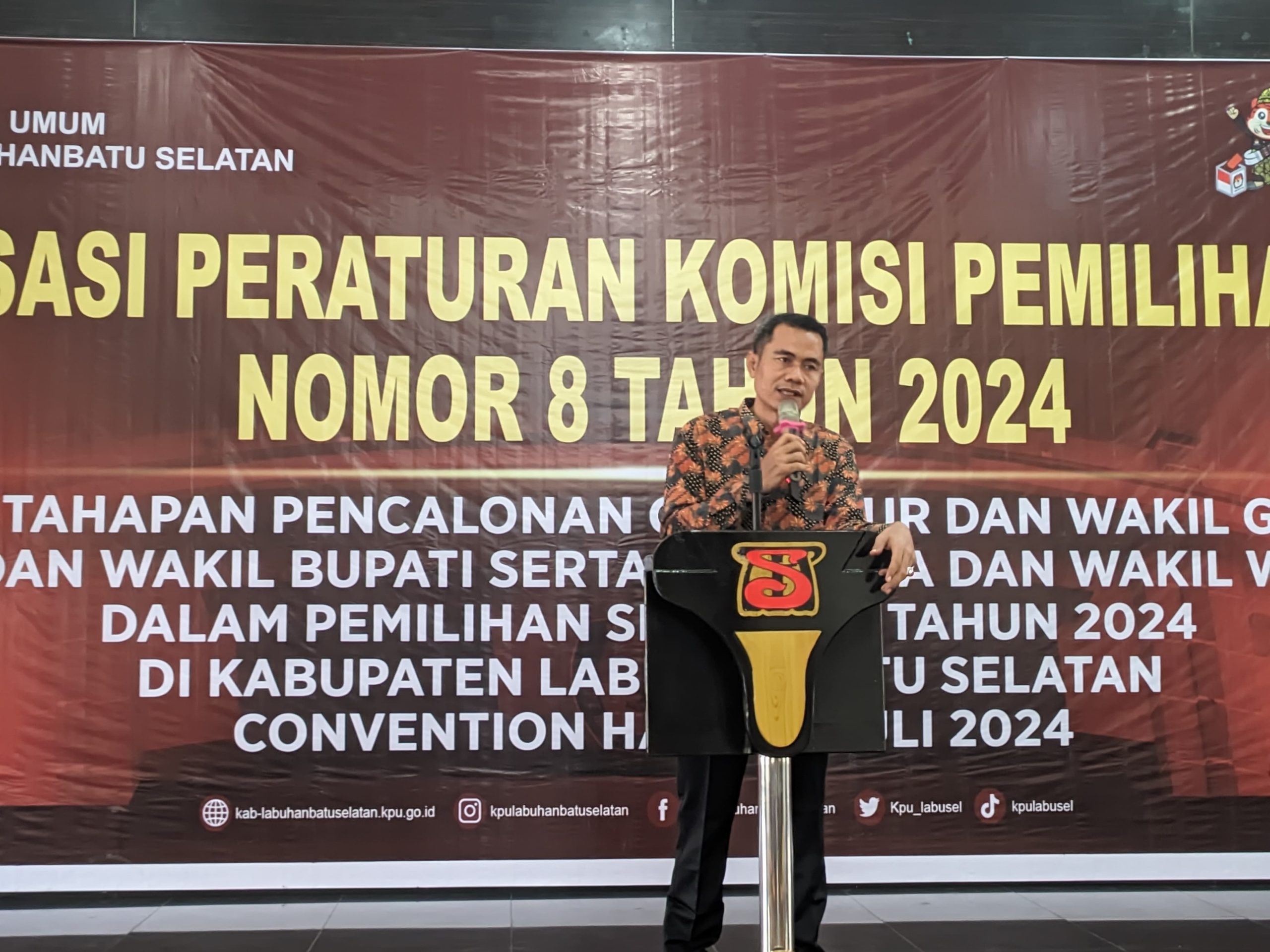 Kegiatan yang digelar di Convetion Hall Sudi Mampir Blok Songo, pada Rabu 17 Juli 2024 tersebut menjelaskam setiap tahapan pencalonan Gubernur dan Wakil Gubernur, Bupati dan Wakil Bupati dalam pemilihan kepala daerah serentak tahun 2024 di Kabupaten Labuhanbatu Selatan.
